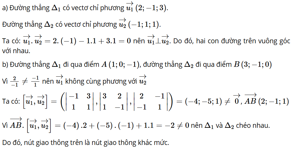 Bài 5.17: Tại một nút giao thông có hai con đường. Trên thiết kế, trong không gian Oxyz, hai con đường đó thuộc hai đường thẳng lần lượt có phương trình: và