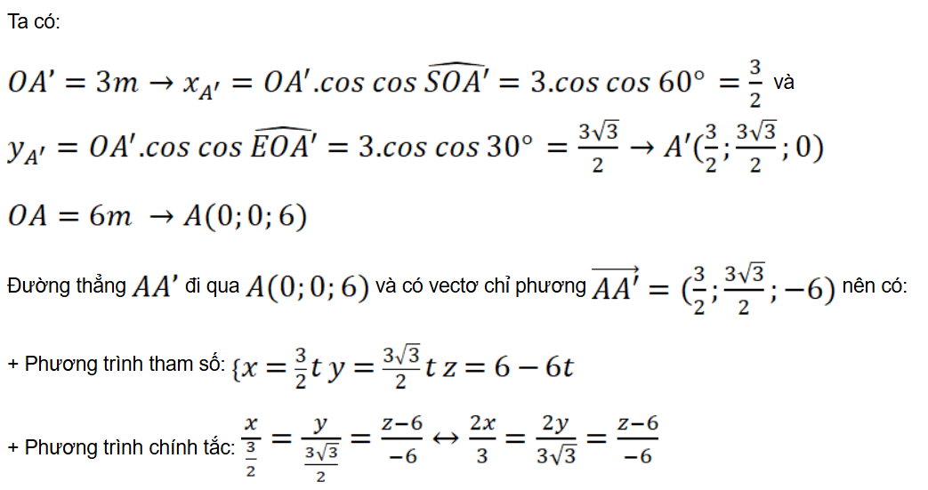Bài 5.19: Trên mặt đất phẳng, người ta dựng một cây cột thẳng cao 6 m vuông góc với mặt đất, có chân cột đặt tại ví trí O trên mặt đất. Tại một thời điểm, dưới ánh nắng mặt trời, bóng của đỉnh cột dưới mặt đất cách chân cột 3 m về hướng S60°E (hướng tạo với hướng nam góc 60° tạo với hướng đông góc 30°) (H.5.32). Chọn hệ trục Oxyz có gốc tọa độ là O, tia Ox chỉ hướng nam, tia Oy chỉ hướng đông, tia Oz chứa cây cột, đơn vị đo là mét. Hãy viết phương trình đường thẳng chứa tia nắng mặt trời đi qua đỉnh cột tại thời điểm đang xét.