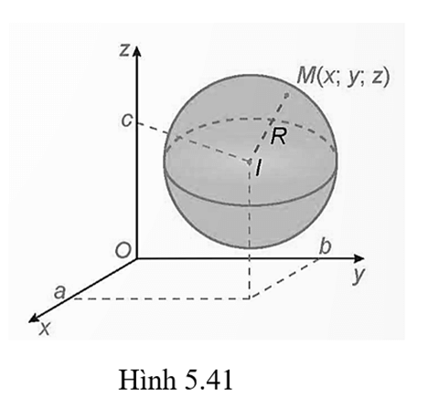 Hoạt động: Trong không gian Oxyz, cho mặt cầu (S) tâm I (a; b; c) bán kính R (H.5.41). Khi đó, một điểm M(x; y; z) thuộc mặt cầu (S) khi và chỉ khi tọa độ của nó thỏa mãn điều kiện gì?
