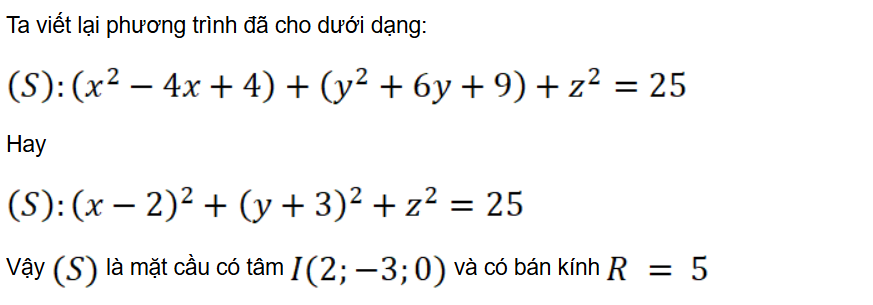 Luyện tập 3: Trong không gian Oxyz, cho (S) là tập hợp các điểm M(x; y; z) có tọa độ thỏa mãn phương trình (S): x2 + y2 + z2 – 4x + 6y – 12 = 0. Chứng minh rằng (S) là một mặt cầu. Xác định tâm và tính bán kính của mặt cầu đó.