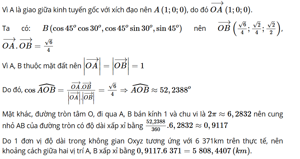 Luyện tập 5: Tính khoảng cách trên mặt đất từ vị trí A là giao giữa kinh tuyến gốc với xích đạo đến vị trí B: 45°N, 30°E.
