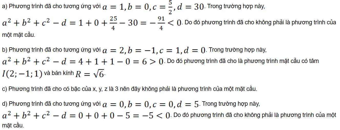 Bài 5.29: Trong không gian Oxyz, phương trình nào trong các phương trình sau là phương trình mặt cầu? Xác định tâm và tính bán kính của mặt cầu đó.