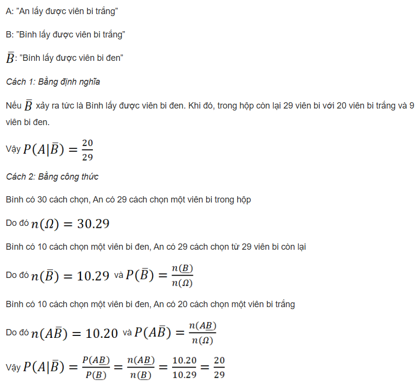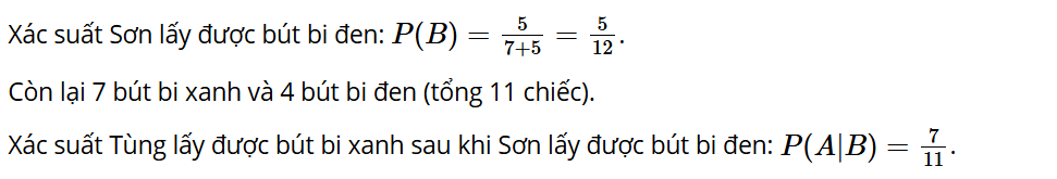 Nếu C xảy ra tức là bạn Sơn lấy được bút bi xanh thì trong hộp còn lại 11 bút bi với 6 bút bi xanh và 5 bút bi đen. Do đó, P(D | C) = .