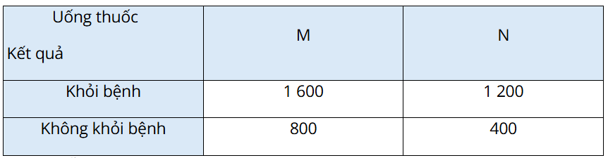 Luyện tập 3: Một công ty dược phẩm muốn so sánh tác dụng điều trị bệnh X của hai loại thuốc M và N. Công ty đã tiến hành thử nghiệm với 4 000 bệnh nhân mắc bệnh X trong đó 2 400 bệnh nhân dùng thuốc M, 1600 bệnh nhân còn lại dùng thuốc N. Kết quả được cho trong bảng dữ liệu thống kê 2 × 2 như sau: