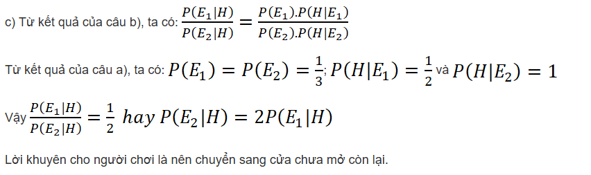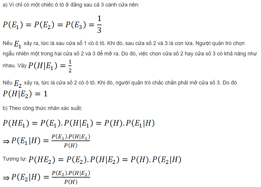 Hướng dẫn: Nếu E1 xảy ra, tức là sau cửa số 1 có ô tô. Khi đó, sau cửa số 2 và 3 là con lừa. Người quản trò chọn ngẫu nhiên một trong hai cửa số 2 và 3 để mở ra. Do đó, việc chọn cửa số 2 hay cửa số 3 có khả năng như nhau. Vậy P(H | E1) = .