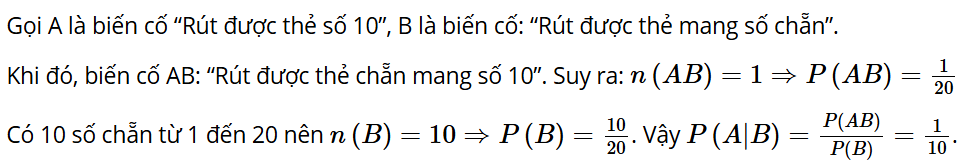 Bài 6.1: Một hộp kín đựng 20 tấm thẻ giống hệt nhau đánh số từ 1 đến 20. Một người rút ngẫu nhiên ra một tấm thẻ từ trong hộp. Người đó được thông báo rằng thẻ rút ra mang số chẵn. Tính xác suất để người đó rút được thẻ số 10.