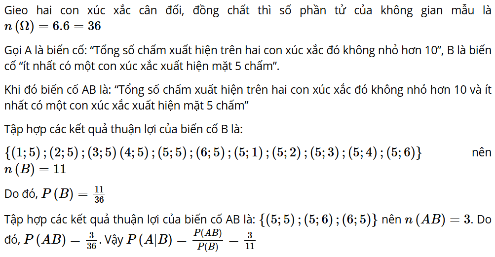 Bài 6.4: Gieo hai con xúc xắc cân đối, đồng chất. Tính xác suất để tổng số chấm xuất hiện trên hai con xúc xắc đó không nhỏ hơn 10 nếu biết rằng có ít nhất một con xúc xắc xuất hiện mặt 5 chấm.