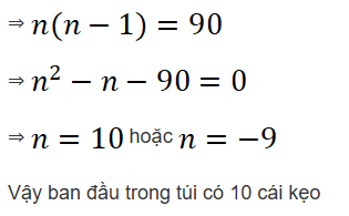Bài 6.6: Trong một túi có một số chiếc kẹo cùng loại, chỉ khác màu, trong đó có 6 cái kẹo màu cam, còn lại là kẹo màu vàng. Hà lấy ngẫu nhiên một cái kẹo từ trong túi, không trả lại. Sau đó Hà lại lấy ngẫu nhiên thêm một cái kẹo khác từ trong túi. Biết rằng xác suất Hà lấy được cả hai cái kẹo màu cam là . Hỏi ban đầu trong túi có bao nhiêu cái kẹo?