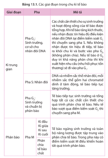 Câu hỏi 3 SGK Sinh 10 Cánh Diều Bài 13 (trang 81): Dựa vào bảng 13.1, cho biết điểm kiểm soát có ở những pha nào trong chu kì tế bào và vai trò của chúng ở mỗi pha là gì?