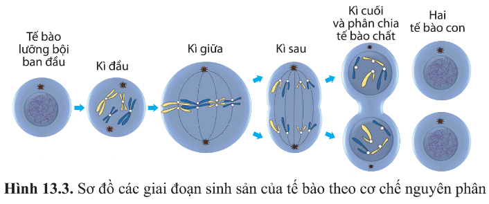 Câu hỏi 5 SGK Sinh 10 Cánh Diều Bài 13 (trang 83): Quan sát hình 13.3, cho biết sinh sản của tế bào gồm những kì nào. Đặc điểm mỗi kỳ là gì?