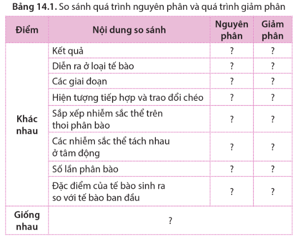 Câu hỏi 5 SGK Sinh 10 Cánh Diều Bài 14 (trang 88): Lập bảng so sánh quá trình nguyên phân và quá trình giảm phân theo gợi ý trong bảng 14.1.