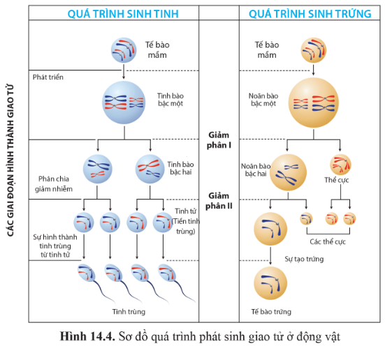 Câu hỏi 7 SGK Sinh 10 Cánh Diều Bài 14 (trang 88): Quan sát hình 14.4, so sánh các giai đoạn của sự phát sinh giao tử đực và sự phát sinh giao tử cái ở động vật?