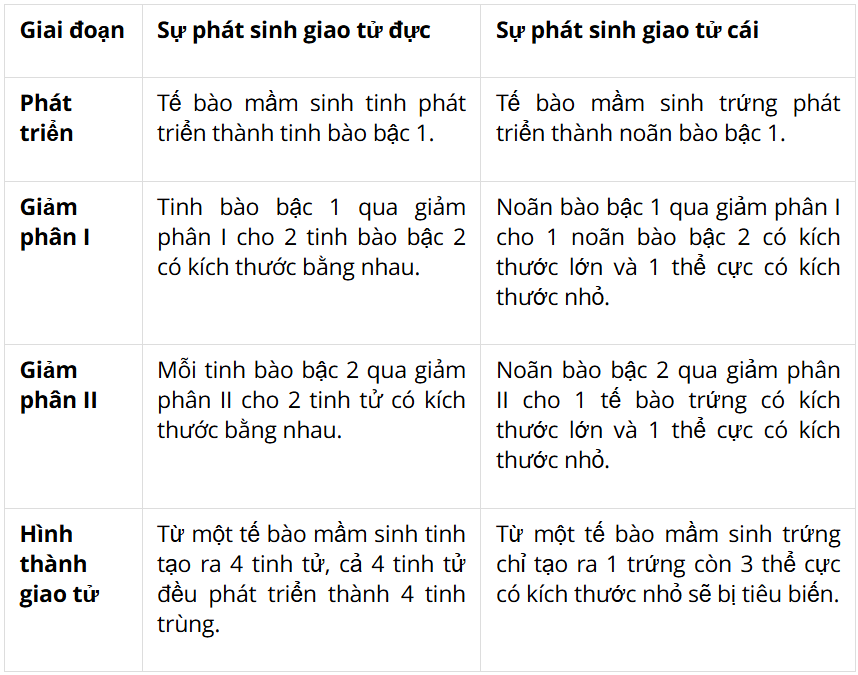 + Tế bào mầm sinh trứng phát triển thành noãn bào bậc một → Noãn bào bậc một tiến hành giảm phân tạo ra 1 tế bào trứng và 3 thể cực → Tế bào trứng hình thành nên giao tử cái, các thể cực tiêu biến. Từ một tế bào mầm sinh trứng chỉ tạo ra 1 trứng (hình thành giao tử cái).
