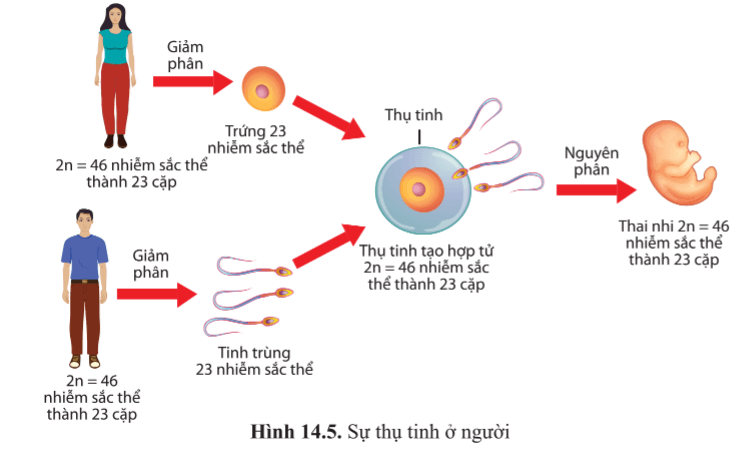 Câu hỏi 8 SGK Sinh 10 Bài 14 (trang 89): Quan sát hình 14.5 và cho biết sự thụ tinh là gì. Hợp tử có bộ nhiễm sắc thể như thế nào so với các giao tử và tế bào sinh dưỡng của cơ thể bố mẹ?