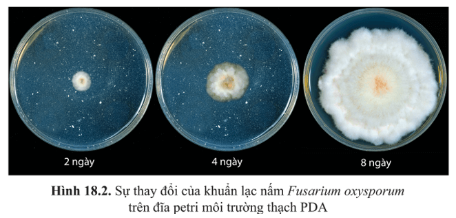 Câu hỏi 1 SGK Sinh 10 Cánh Diều Bài 18 (trang 109): Quan sát hình 18.2 và nhận xét sự thay đổi của khuẩn lạc nấm (quần thể nấm) Fusarium oxysporum theo thời gian. Vì sao có sự thay đổi này?