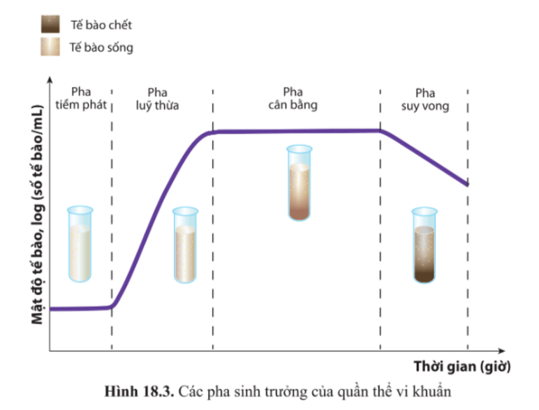 a. Ở pha tiềm phát, chất dinh dưỡng đầy đủ mà mật độ quần thể vi khuẩn gần như không thay đổi vì vi khuẩn chưa phân chia mà mới bắt đầu thích ứng dần với môi trường, tổng hợp các enzyme trao đổi chất và DNA, chuẩn bị cho quá trình phân bào nên mật độ tế bào vi khuẩn trong quần thể dường như không thay đổi (số lượng tế bào sinh ra bằng số lượng tế bào chết).