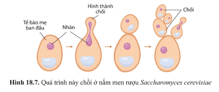 + Nảy chồi: Tế bào nhân đôi chất di truyền và biến đổi màng tế bào phát triển về một phía thành ống rỗng. Một phần tế bào chất và chất di truyền chuyển dịch vào cuối ống rỗng, ỗng rỗng phình to hình thành chồi và tách thành tế bào con.