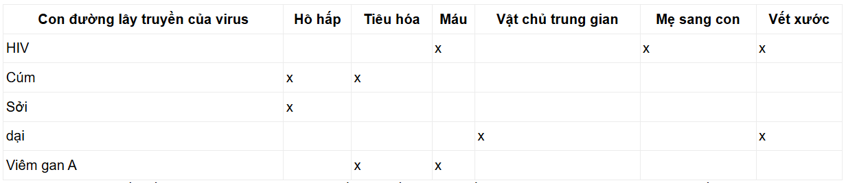 Luyện tập 1: Hãy cho biết con đường lây truyền của virus HIV, cúm, sởi, dại, viêm gan A theo gợi ý trong bảng 22.1.