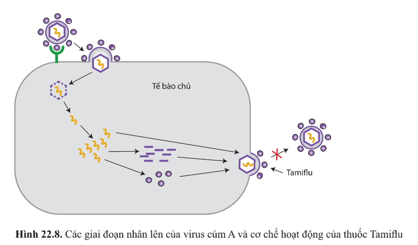 Câu hỏi 12: Nêu các giai đoạn trong chu trình nhân lên của virus. Quan sát hình 22.8 và cho biết thuốc tamiflu ức chế giai đoạn nào trong chu trình nhân lên của virus cúm A?