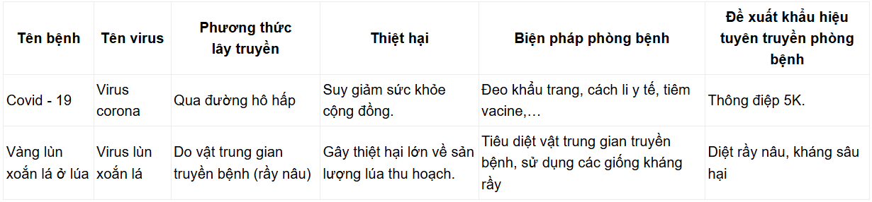 Câu hỏi: Hãy tìm hiểu thông tin, điều tra ở địa phương về một số bệnh do virus gây ra đối với người, động vật hoặc thực vật để hoàn thành báo cáo theo gợi ý như bảng 22.2