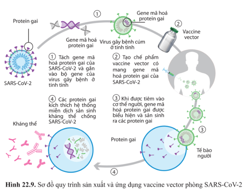 Câu hỏi 14: Quan sát hình 22.9 và mô tả lại quy trình sản xuất và sử dụng vaccine vector phòng SARS-CoV-2.