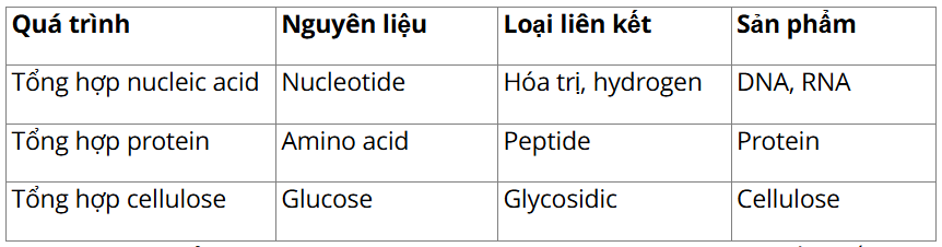 Câu hỏi 1: Cho một số ví dụ về quá trình tổng hợp các chất trong tế bào (nêu rõ nguyên liệu tham gia, loại liên kết và sản phẩm được hình thành).