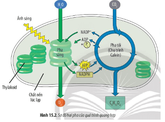Câu hỏi 4 SGK Sinh 10 Chân trời sáng tạo Bài 15 (trang 73): Dựa vào Hình 15.2, hãy phân biệt pha sáng và pha tối về: nơi diễn ra, điều kiện ánh sáng, nguyên liệu tham gia và sản phẩm tạo thành.