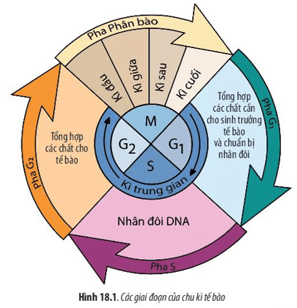 Câu hỏi 3 SGK Sinh 10 Chân trời sáng tạo Bài 18 (trang 86): Hãy quan sát Hình 18.1 và cho biết: Chu kì tế bào gồm những giai đoạn nào? Kể tên các giai đoạn của chu kì tế bào.