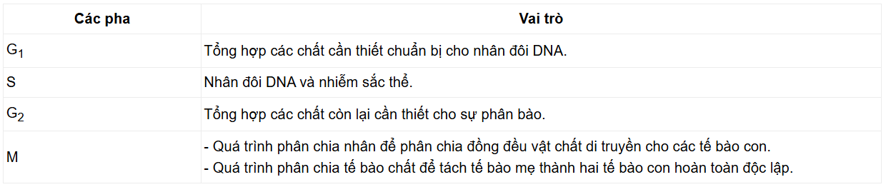 => Pha G1 tổng hợp các chất và bào quan cần thiết, đồng thời cho phép chu kì tế bào được tiếp diễn, tạo nền tảng cho sự nhân đôi của DNA, nhiễm sắc thể ở pha S và sự phân chia ở pha M, pha M phân chia tế bào để các tế bào mới tiếp tục bước vào các pha để phân chia.