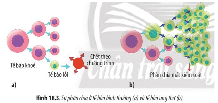 - Ở tế bào ung thư, khi xuất hiện tế bào lỗi, tế bào này bị mất kiểm soát, không chết theo chương trình mà tiếp tục phân chia tạo ra nhiều tế bào lỗi.