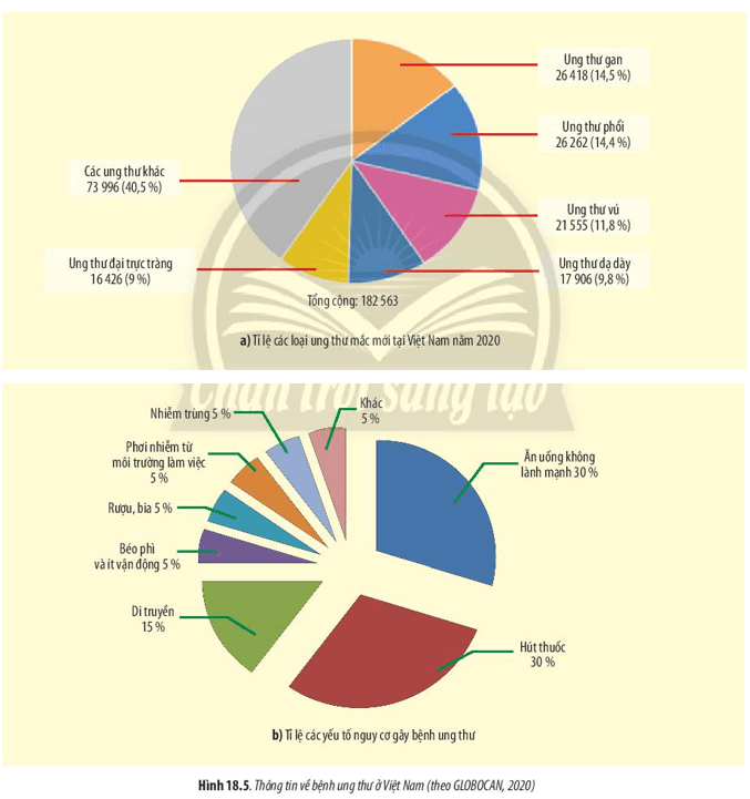 Luyện tập (trang 89): Thông qua các biểu đồ của Hình 18.5, hãy cho biết yếu tố nào có nguy cơ cao gây ung thư và cách phòng tránh bệnh ung thư.