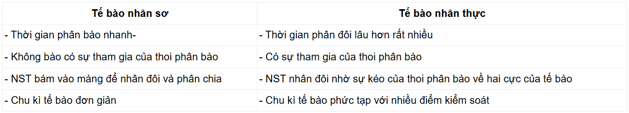 * Những điểm khác biệt của chu kì tế bào ở sinh vật nhân sơ và sinh vật nhân thực