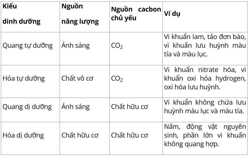 - Hãy lập bảng so sánh các kiểu dinh dưỡng khác nhau ở vi sinh vật.