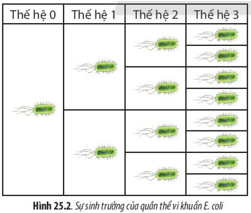 Câu hỏi 1 SGK Sinh 10 Chân trời sáng tạo Bài 25 (trang 119): Dựa vào Hình 25.2, hãy nhận xét số lượng tế bào vi khuẩn E. coli sau mỗi lần phân chia. Từ đó, hãy cho biết khái niệm sinh trưởng ở vi sinh vật.