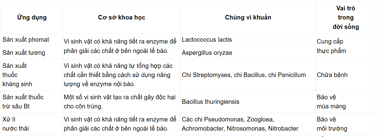 Câu hỏi 3 SGK Sinh 10 Chân trời sáng tạo Bài 27 (trang 132): Hãy tóm tắt một số ứng dụng của vi sinh vật trong đời sống (tên ứng dụng, cơ sở khoa học, loại vi sinh vật được sử dụng, vai trò trong đời sống,..).