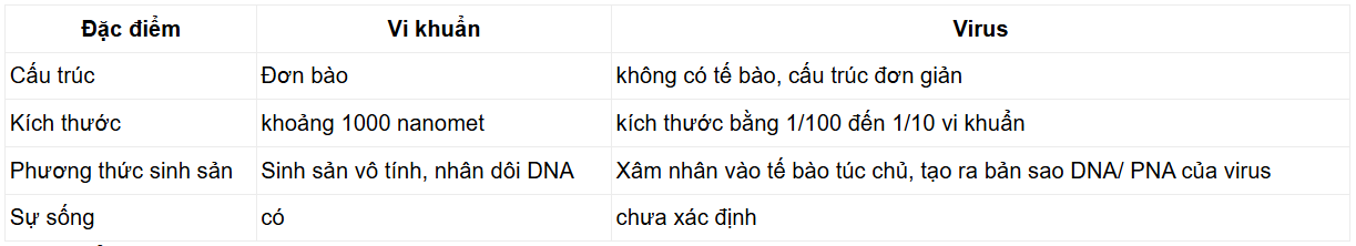 Luyện tập SGK Sinh 10 Chân trời sáng tạo Bài 29 (trang 140): Virus khác với vi khuẩn ở những điểm nào?