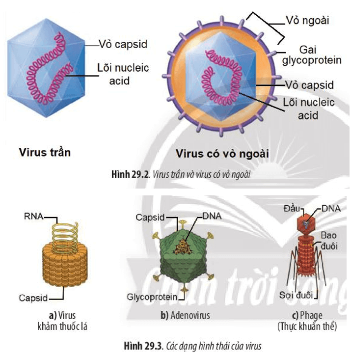 Câu hỏi 2 SGK Sinh 10 Chân trời sáng tạo Bài 29 (trang 141): Dựa vào Hình 29.2 và 29.3, hãy: Nêu cấu tạo của virus.