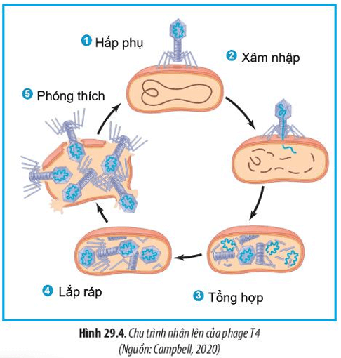 Bài tập 1 SGK Sinh 10 Chân trời sáng tạo Bài 29 (trang 144): Trình bày và giải thích các bước nhân lên của phage trong tế bào vật chủ.