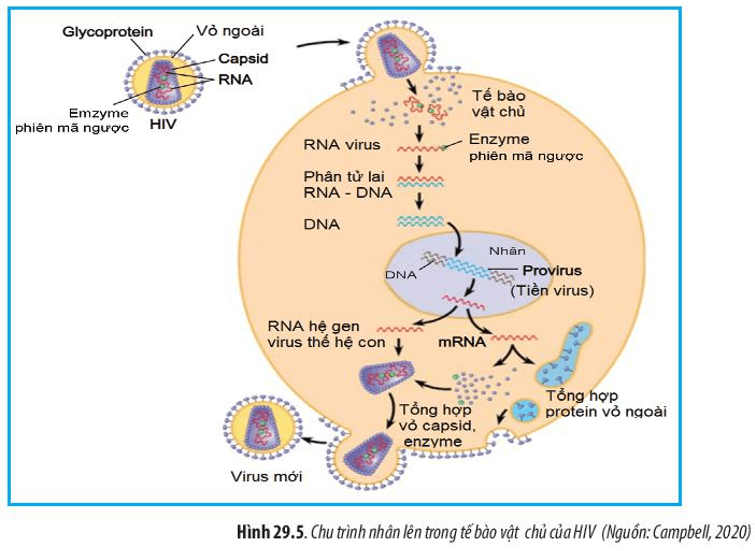 Câu hỏi 5 SGK Sinh 10 Chân trời sáng tạo Bài 29 (trang 142): Quan sát Hình 29.5, hãy mô tả quá trình nhân lên của HIV trong tế bào vật chủ.