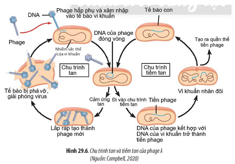 Luyện tập SGK Sinh 10 Chân trời sáng tạo Bài 29 (trang 143): Quan sát Hình 29.6, hãy trình bày mối liên hệ giữa chu trình sinh tan và tiềm tan ở phage λ.