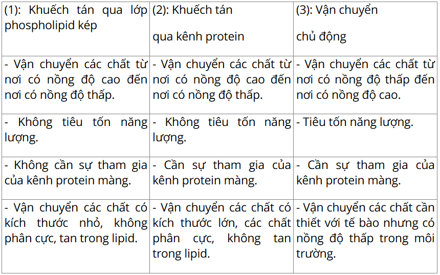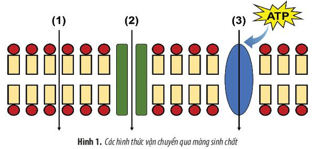 Bài tập 2: Hình 1 mô tả quá trình vận chuyển các chất qua màng sinh chất. Hãy cho biết (1), (2), (3) là hình thức vận chuyển gì? Phân biệt các hình thức vận chuyển đó.