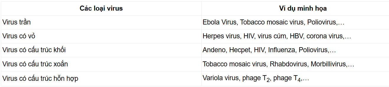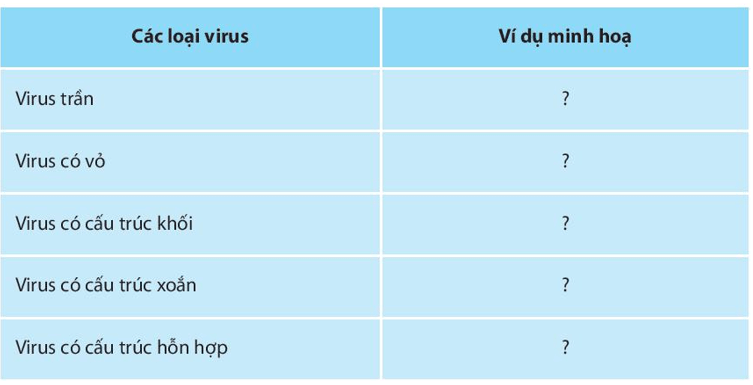 Bài tập 1: Tìm ví dụ minh hoạ cho các loại virus theo nội dung bảng sau: