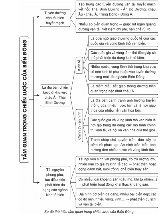 + Hiện nay, Biển Đông có vị trí địa - chính trị quan trọng đối với các quốc gia khu vực châu Á - Thái Bình Dương. Khi giao thương trên biển phát triển, sự phụ thuộc của các quốc gia vào các tuyến đường biển đi qua Biển Đông ngày càng lớn hơn. Vì thế, an ninh trên Biển Đông sẽ ảnh hưởng trực tiếp đến lợi ích an ninh, chính trị và sự thịnh vượng về mặt kinh tế của khu vực, trong đó có Việt Nam.