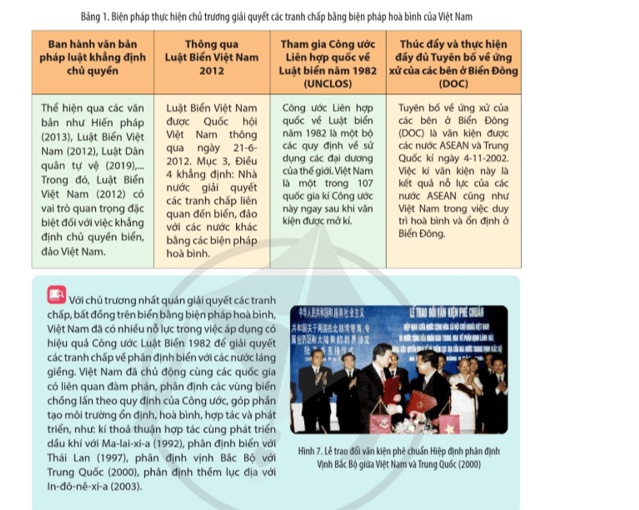 Câu hỏi SGK Giải Sử 11 Cánh Diều Bài 13 (trang 89): Đọc thông tin và quan sát Bảng 1, Hình 7, cho biết chủ trương của Việt Nam trong việc giải quyết các tranh chấp ở Biển Đông.