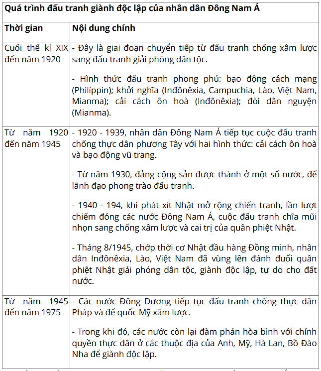 - Các giai đoạn phát triển của phong trào đấu tranh giành độc lập của nhân dân Đông Nam Á:
