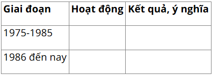 Luyện tập 1 (trang 82) Sử 12 Cánh Diều Bài 13: Hoàn thành bảng về hoạt động đối ngoại của Việt Nam từ năm 1975 đến nay theo mẫu sau vào vở ghi.