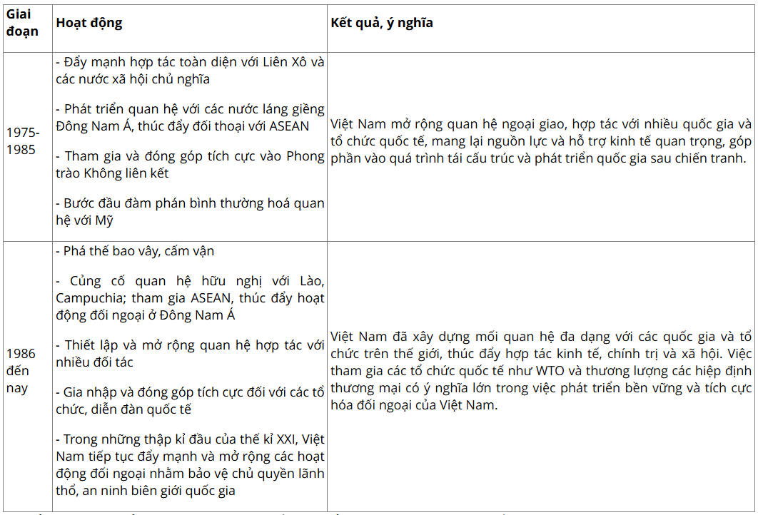 - Một trong những hoạt động đối ngoại quan trọng của Việt Nam từ năm 1975 đến nay là quá trình hòa nhập và phát triển kinh tế toàn cầu. Sau chiến tranh, Việt Nam mở rộng quan hệ ngoại giao, gia nhập nhiều tổ chức quốc tế và thực hiện chính sách cửa mở. Việc tham gia vào cộng đồng kinh tế quốc tế, ký kết các hiệp định thương mại và thu hút đầu tư nước ngoài đã giúp nước ta đạt được những bước phát triển ấn tượng, đồng thời củng cố vị thế quốc tế và tạo điều kiện thuận lợi cho sự nghiệp xây dựng đất nước.