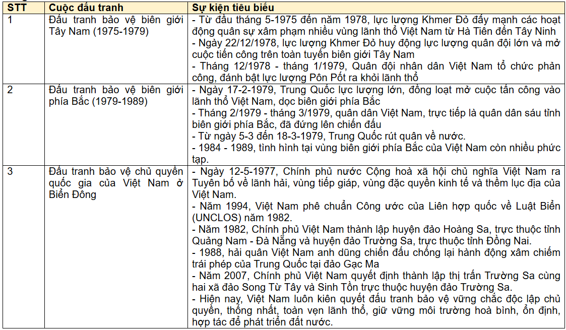 Luyện tập 1 (trang 59) Sử 12 Cánh diều Bài 9: Lập bảng thống kê những sự kiện chính của cuộc đấu tranh bảo vệ Tổ quốc từ sau tháng 4-1975 đến nay.