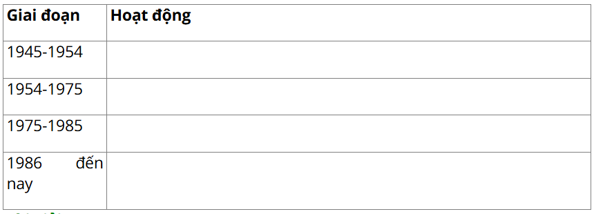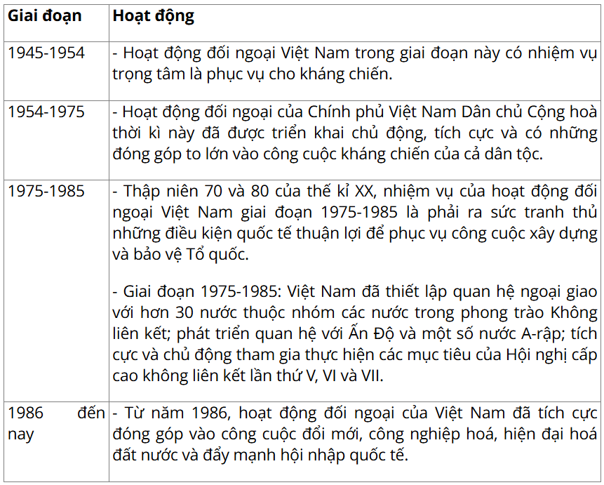 Lập bảng tóm tắt hoạt động đối ngoại của Việt Nam từ năm 1945 đến nay theo gợi ý sau vào vở:
