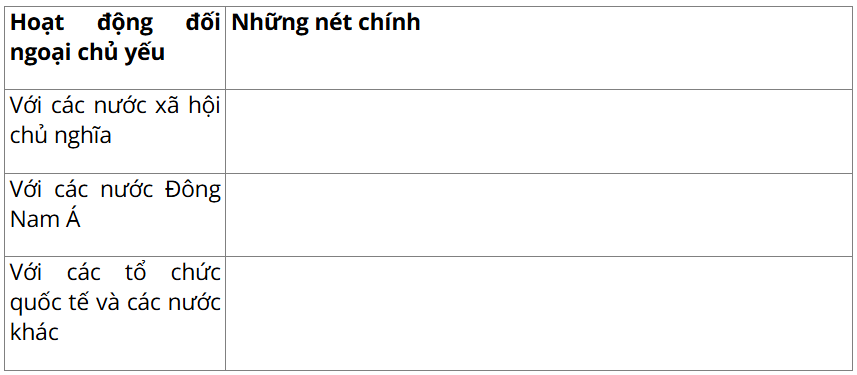 Với các tổ chức quốc tế và các nước khác | - Việt Nam tích cực thiết lập quan hệ với nhiều tổ chức quốc tế và nhiều nước trên thế giới và trong khu vực. - Việt Nam tích cực đấu tranh chống chính sách cấm vận của Mỹ, hợp tác giải quyết các vấn đề nhân đạo...; đẩy mạnh quan hệ với các nước tư bản, thành lập cơ quan đại diện ngoại giao ở nhiều nước, gia nhập các tổ chức quốc tế,... - Việt Nam tham gia các hoạt động góp phần phát huy vai trò tích cực của Phong trào Không liên kết trong cuộc đấu tranh bảo vệ hoà bình. |